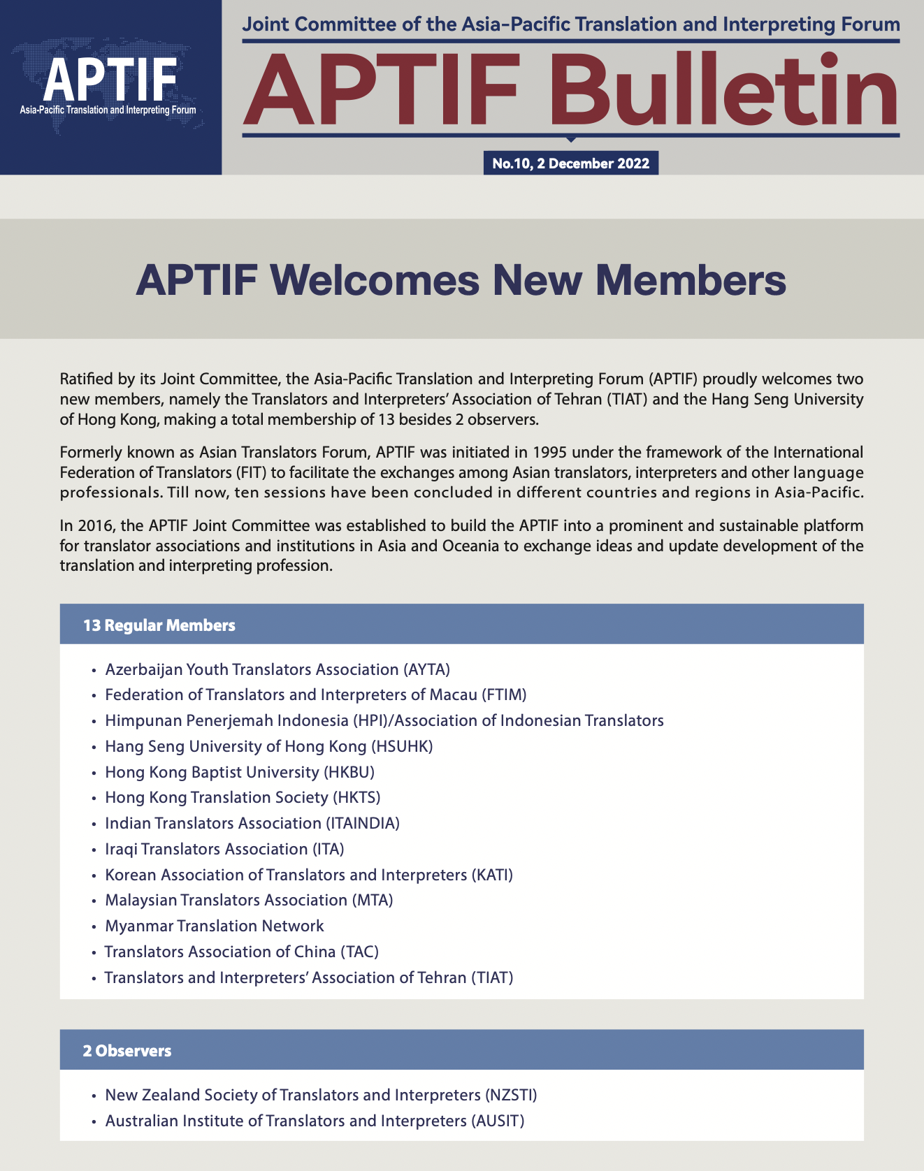 APTIF Bulletin is the e-newsletter of the Joint Committee of the Asia-Pacific Translation and Interpreting Forum (APTIF). Targeting language professionals, industry managers and others in the Asia-Pacific translation and interpreting community, the bulletin addresses overall development of the profession in this region while demonstrating global vision for exchanges.