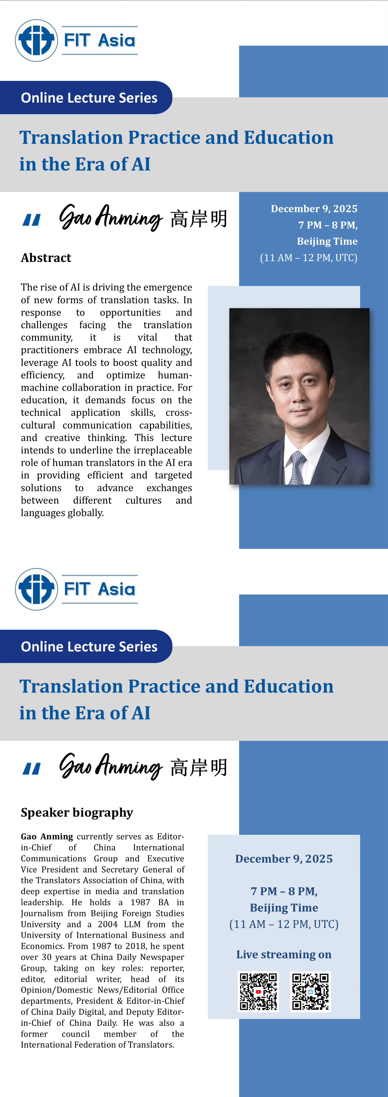 As FIT Asia's flagship annual academic initiative, this lecture series will continue to gather leading scholars and industry trailblazers worldwide. By leveraging the power of online connectivity, it will link translation wisdom across Asia and the globe, driving innovation and elevation for the translation profession in the AI age.